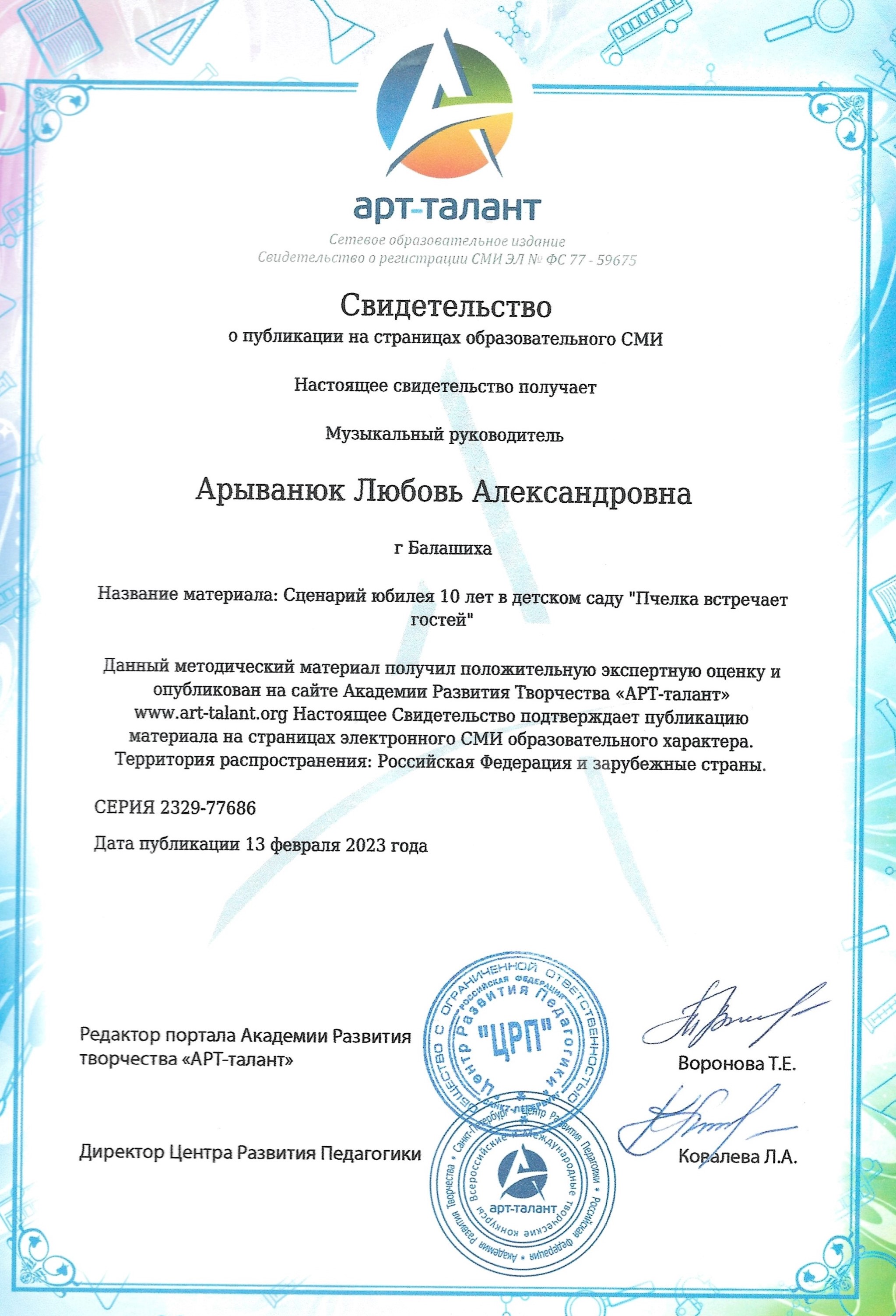 Свидетельство о публикации на страницах образовательного СМИ